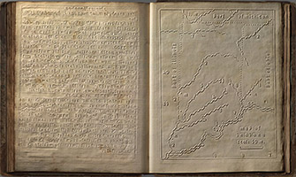Atlas of the united states, Printed for the use of the blind, at the expense of John C. Cray; under the direction of S.G. Howe. at the New England Institution for the Education of the Blind (Boston) in 1837. The New England Institution for the Education of the Blind (Boston), under the direction of Samuel Gridley Howe, obtained their first printing press in 1835. From this press they began publishing several works in the tactile (raised letter) format. This institution was the pioneering American concern for publishing for the blind and this was one of their first books and apparently the second version of the geography atlas with embossed maps and specially designed text. Twenty-four states mapped. Reputedly 50 copies printed, 4 extant. The atlas was actually prepared by Samuel P. Ruggles. In raised symbology, the atlas shows the outline of each state, rivers and other water bodies, cities, longitudes, latitudes, and mountains. Accompanying embossed text describes the map features in some detail, and the state's area, population, climate, commerce, etc. The atlas was the first intended to be used by the blind without the assistance of a sighted person. |